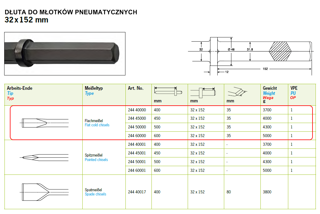Dłuto płaskie 400 mm 35 mm 32x152 mm