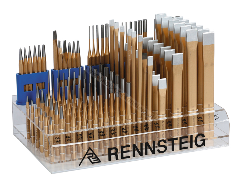 • Pudełko z przezroczystego akrylu ze specjalnie wykonanymi przegródkami, których wymiary odpowiadają narzędziom Rennsteig.