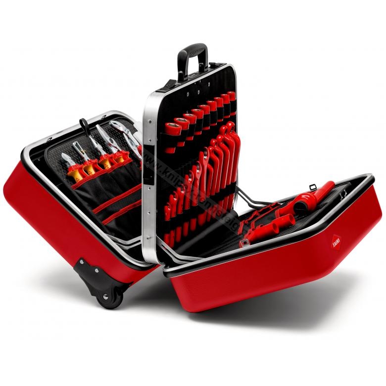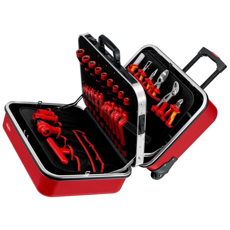 - Trwała konstrukcja z materiału ABS, czerwony kolor; wyposażona w gamę narzędzi KNIPEX do pracy w systemach, przetestowanych zgodnie z normą DIN EN/IEC 60900